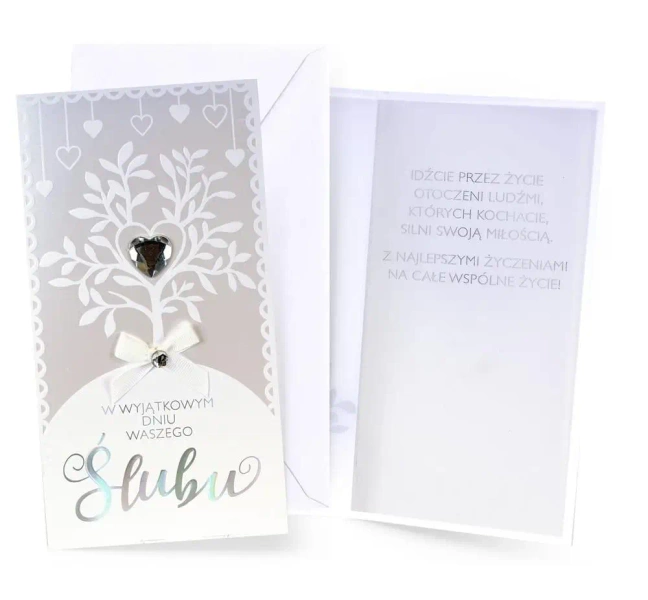 Szczególne cechy karnetu to przede wszystkim bogate zdobnictwo: co najmniej dwa rodzaje folii (metalizowanej, perłowej lub holograficznej) oraz brokat. Uzupełnieniem są elementy nakładane oraz wycinanki laserowe i wstążeczki - wszystko zależy od konkretnego projektu. Środek kartki ozdobiony jest subtelna grafiką oraz niepowtarzalnymi życzeniami. Do zestawu dołączona jest koperta, idealnie dopasowana kolorystycznie. Kartki przeznaczone są na okoliczność takiej uroczystości jak ślub.