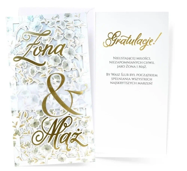 W naszej kolekcji Passion Moments, każdy karnet to prawdziwe małe dzieło sztuki - unikalne, nie do podrabiania, zachwycające swym urokiem. Nasze kartki PM charakteryzują się bogatymi zdobieniami, które dzięki stonowanej stylistyce, równocześnie mają w sobie coś ze skromnej elegancji. Najważniejszy jest dbałość o detale i staranne wykonanie. Wszystko zależy od konkretnej propozycji, ale zdobienia z użyciem złotej, srebrnej, perłowej lub holograficznej folii, dodatków w postaci biżuterii, kokard, brokatu, dekoracji wyciętych laserem, wstążek i innych ozdób, to stały element naszych karnetów. Znajdziesz tu każdorazowo przemyślaną grafikę i szczere życzenia. Każda kartka sprzedawana jest w zestawie z odpowiednio dobraną kopertą. Szczególnością jest: zdobienie: co najmniej dwiema foliami (metalicznymi/perłowymi/holograficznymi), brokatem, dodatkami, wycięciami laserowymi, wstążeczkami - wszystko zależy od konkretnej propozycji, wnętrze: delikatna i myśląca grafika, unikalne życzenia, w zestawie: harmonijnie dobrana kolorystycznie koperta. Okazją do wręczenia jest Ślub. Po złożeniu wymiary karnetu wynoszą: 11,4 x 21,5 cm.