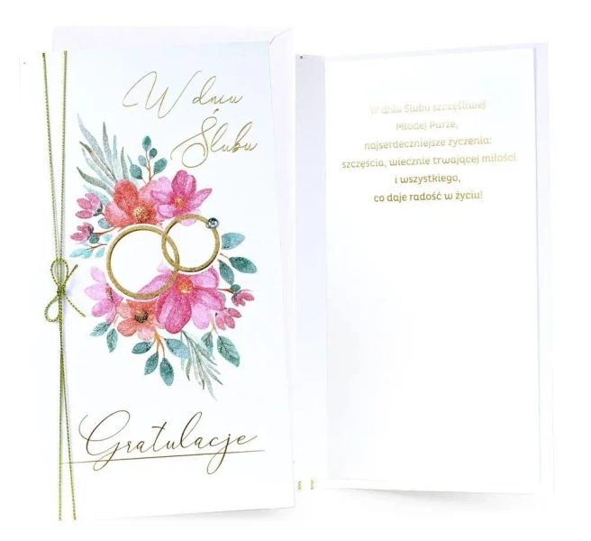 Przedstawiamy kartki z serii Passion Moments, które są prawdziwymi małymi dziełami sztuki - unikalnymi, nie do podrobienia, o zjawiskowym designie. Są one bardzo efektownie ozdobione, aczkolwiek z szacunkiem dla dyskrecji i elegancji, a ich niepowtarzalność zdecydowanie polega na dbałości o detale i perfekcji wykonania. W zależności od konkretnego modelu, dekoracje na kartkach obejmują elementy z folii złotej, srebrnej, perłowej lub holograficznej, ozdoby biżuteryjne, kokardy, wycinanki laserowe, brokat, wstążki i inne akcesoria. Wewnątrz każdego karnetu znajduje się atrakcyjna grafika i życzenia. Każda kartka dostarczana jest z dopasowaną kopertą. Szczególne cechy to: ozdoby: minimum dwie folie (metaliczne/perłowe/holograficzne), brokat, dodatki przyklejone, wycinanki laserowe, wstążeczki, w zależności od konkretnego wzoru, wnętrze: z delikatnym rysunkiem, unikalne życzenia w środku, w zestawie: koperta dopasowana kolorystycznie, okazja: Ślub. Rozmiary karnetu po złożeniu wynoszą: 11,4 x 21,5 cm.