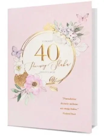 Jest to komplet o wymiarach B6, składający się z gustownego karnetu oraz dopasowanej do niego koperty. Idealnie sprawdza się jako elegancki sposób na przekazanie życzeń z okazji 40. rocznicy ślubu.