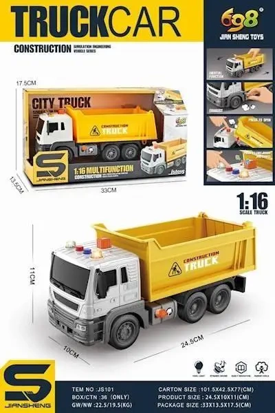 Prezentujemy Ci wielofunkcyjną wywrotkę. Ta unikalna zabawka posiada wbudowane efekty świetlne i dźwiękowe, które z pewnością przyciągną uwagę każdego dziecka. Jej rozmiary to 33x17,5x13,5 cm, co sprawia, że jest idealnie proporcjonalna i wiernie odwzorowuje prawdziwe wywrotki w skali 1:16.