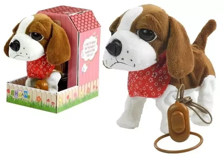 Zabawka dla dzieci -- Interaktywny piesek na smyczy w kolorze biało-brązowym z budą od Leantoys