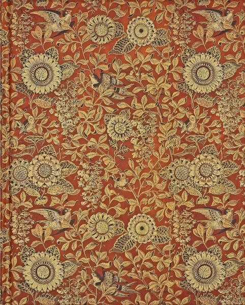 Na okładce prezentowany jest wzór jedwabnej zasłony wykonanej przez renomowanych tkaczy z londyńskiego Spitalfields, datowanej na około 1880 rok. Wzór ten jest teraz eksponatem w Muzeum Wiktorii i Alberta.