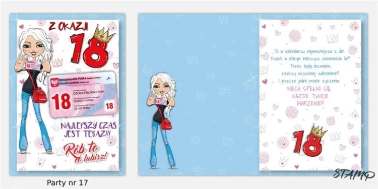 Karty okazjonalne na 18. urodziny z dołączonym naklejonym dowodem osobistym