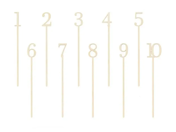 Zaproponuj wyjątkowy sposób numerowania stołów w swoim wydarzeniu, wybierając nasz zestaw drewnianych numerów stołowych. Pakiet zawiera numery od 1 do 10, a każdy z nich ma wysokość około 25 cm. W jednym opakowaniu otrzymasz 10 sztuk.