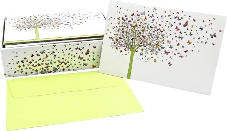 Marka Peter Pauper Press prezentuje elegancką kolekcję unikalnych karnetów na różne okazje, ozdobionych motywem Drzewa Motyli. Każda z kartek ozdobiona jest efektowną złotą folią, która w fenomenalny sposób podkreśla pastelowy wzór drzewa otoczonego motylami.