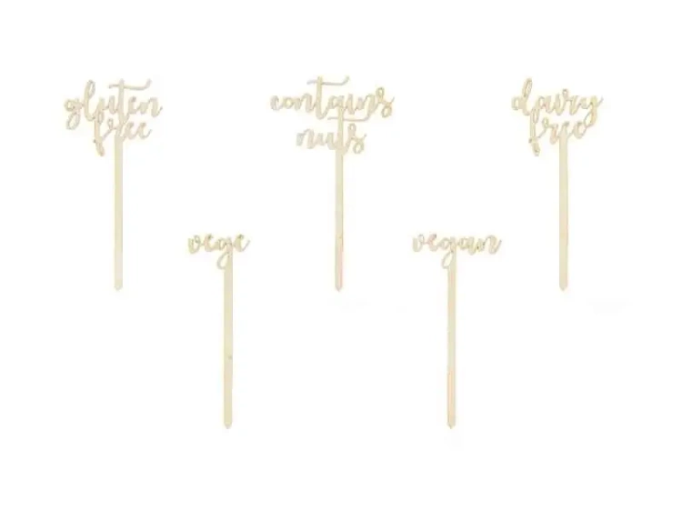 Zestaw zawiera 5 drewnianych topperów, z napisami: "Vege", "Vegan", "Dairy free", "Contains nuts" oraz "Gluten free", podkreślający różnorodność wyboru. Ich wysokość wynosi około 14,5-16 cm, co sprawia, że są one doskonale widoczne, a jednocześnie nie przeszkadzają gościom.