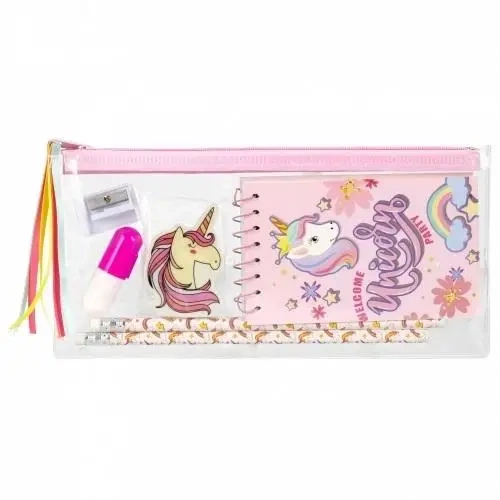 W zestawie znajdują się takie artykuły szkolne jak: przezroczysty piórnik z zamkiem błyskawicznym, mały notes A6 na spirali, para ołówków, mini zakreślacz, gumka oraz temperówka.Inne produkty STARPAK