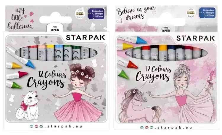 Firma Starpak oferuje dwa typy kredek woskowych: standardowe i świecowe. Te drugie są nieco tłustsze i odporne na wodę, co sprawia, iż są bardziej praktyczne dla młodszych dzieci. Starpak oferuje aż 14 różnych wzorów kredek woskowych, co pozwoli na rozbudowanie kreatywności najmłodszych.EAN: 5904335838077
