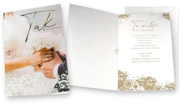 Rozmiary karnetu po złożeniu to 15cm x 22,5 cm. Wystrój każdej kartki jest unikalny i zależny od konkretnego wzoru - niektóre są ozdobione złotą folią, podczas gdy inne dekorowane są folią holograficzną.Życzenia i koperta
