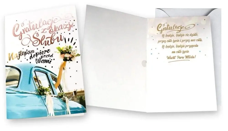 Ta unikalna kartka ślubna z serii Simfonica zaskakuje nie tylko swoim rozmiarem i uroczym wzorem, ale także pewnym muzycznym dadatkem. Kiedy otwierasz kartkę, uruchamia się popularna melodia "Bałkanica" wykonywana przez zespół Piersi. Wymiary złożonej kartki to 15cm x 22,5cm, a jej ozdoby zależą od wzoru i obejmują złotą folię lub folię holograficzną. Dodatkowym atutem jest to, że każda kartka zawiera życzenia w środku oraz dołączoną kopertę do wysyłki.