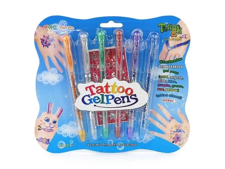 Prezentowany zestaw to kolorowe długopisy do tatuaży. W skład zestawu wchodzą długopisy w sześciu różnorodnych odcieniach, co umożliwia tworzenie ciekawych i zróżnicowanych wzorów. Charakterystyczną cechą długopisów jest brokatowy efekt, który dodaje tatuażom wyjątkowego blasku.