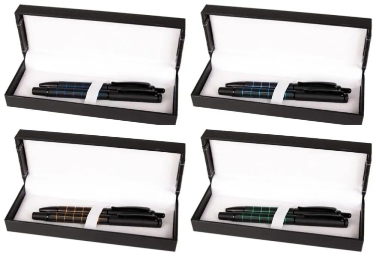 Zestaw piśmienniczy DORIAN to klasyczne piękno w czarnym odcieniu z przeplatającą się kolorową kratą. Zestaw obejmuje pióro wieczne z irydową stalówką oraz długopis , dając tym samym pełną gamę narzędzi do pisania.