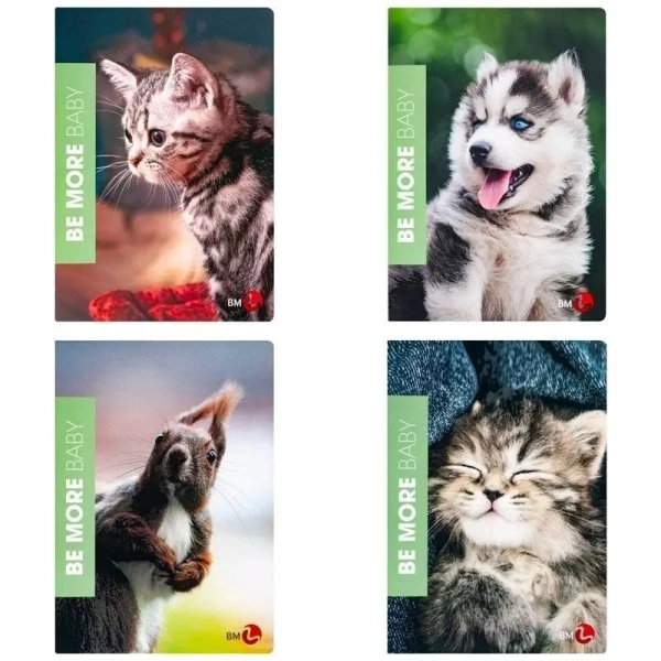 Pakiet zawiera dziesięć zeszytów formatu A4. Wyróżniające elementy to okładki zdobione atrakcyjnymi zdjęciami zwierząt. Oznaczają one unikalną kolekcję "Be More Baby". Każde zdjęcie jest delikatnie pokryte lakierem UV, aby wyeksponować nawet najmniejsze szczegóły i nadać obrazom głębi. Kolekcja oferuje różnorodne wzory dostępne jako mix, co sprawia, że każdy zeszyt jest wyjątkowy.