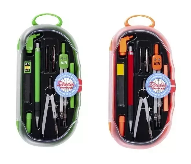 W skład zestawu wchodzą: dwa cyrklele - jeden z długimi ramionami, drugi z krótkimi oraz możliwością regulacji, uchwyt do ołówka, grafion, uchwyt do grafionu, automatyczny ołówek przystosowany do wkładów o grubości 0,5 mm, zestaw rysików do ołówka, a także zapasowy rysik i szpilka.Wygodne przechowywanie