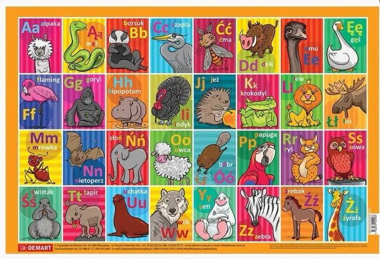 Ta urocza podkładka z polskim alfabetem to doskonałe narzędzie dla młodych uczniów. Pokazuje ona różnice między małymi i dużymi literami drukowanymi. Zastosowanie wszystkich liter alfabetu pokazane jest na przykładzie nazw różnych zwierząt. To ułatwia zrozumienie kolejności liter w polskim alfabecie. Podkładka obejmuje również polskie znaki diakrytyczne takie jak: ą, ę, ć, ł, ń, ó, ś, ź, ż.