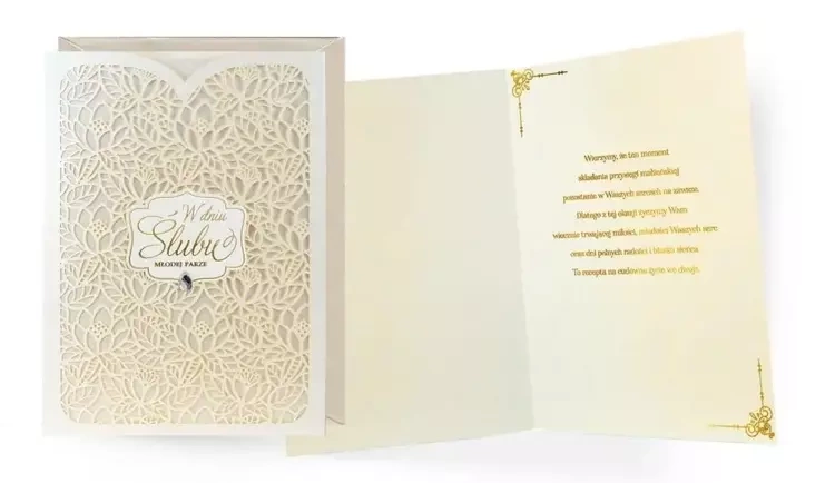 Wnętrze:Zawartość kartki również nie pozostanie niezauważona. Wyjątkowe życzenia w środku podkreślają indywidualny charakter tego produktu, czyniąc go idealnym wyborem na prezent ślubny.