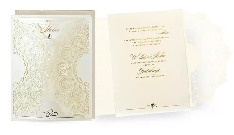 Karnet po złożeniu osiąga wymiary 14,5 x 19,5 cm i jest dodatkowo dopasowany kolorystycznie do załączonej koperty. Wewnątrz karty znajdują się starannie dobrane, unikatowe życzenia. Zdobienia, które wykorzystano w tym modelu, są różnorodne i bogate - w zależności od konkretnego wzoru mogą to być dekoracje, elementy biżuteryjne, brokat, metaliczne folie, odstawniki, tłoczenia i wiele innych. Karnet jest dedykowany na okazje ślubne.