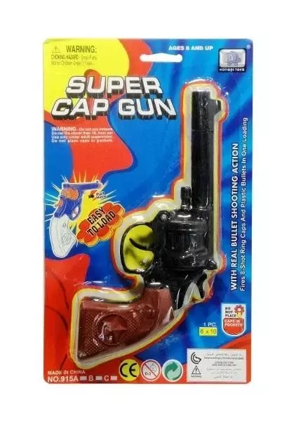 Zabawkowy pistolet na spłonkę wykonany z plastiku. Jest umieszczony w praktycznym opakowaniu typu blister, który składa się z kartonowej podstawy i przezroczystego klosza. Zabawka jest rekomendowana dla dzieci w wieku 8 lat i starszych. Wymiary podane w opisie są wymiarami opakowania.