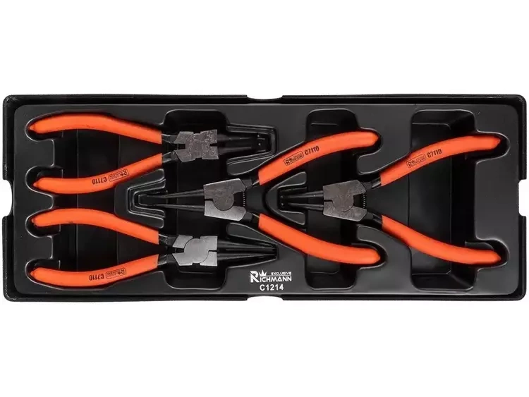 Szczypce do pierścieni zabezpieczających / szczypce Seegera Corona Exclusive 1214 W skład zestawu 4 sztuk szczypiec do pierścieni / Seegera Corona Exclusive C1214 wchodzą: szczypce zewnętrzne wygięte 180 mm szczypce wewnętrzne wygięte 180 mm szczypce zewnętrzne proste 180 mm szczypce wewnętrzne proste 180 mm Warto wiedzieć: szczypce Seegera marki Corona Exclusive wykonane zostały ze stali chromowo - wanadowej; szczypce rozmieszczone bezpiecznie we wkładce narzędziowej; wkładka narzędziowa ze szczypcami Seegera typu A o rozmiarze 385 x 150 mm idealnie pasuje do szuflad wózka narzędziowego Corona Exclusive oraz nadstawek narzędziowych wózków;