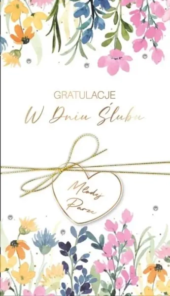 Okolicznościowy karnet w zestawie z kopertą, zapisany życzeniami dla młodej pary w środku.
