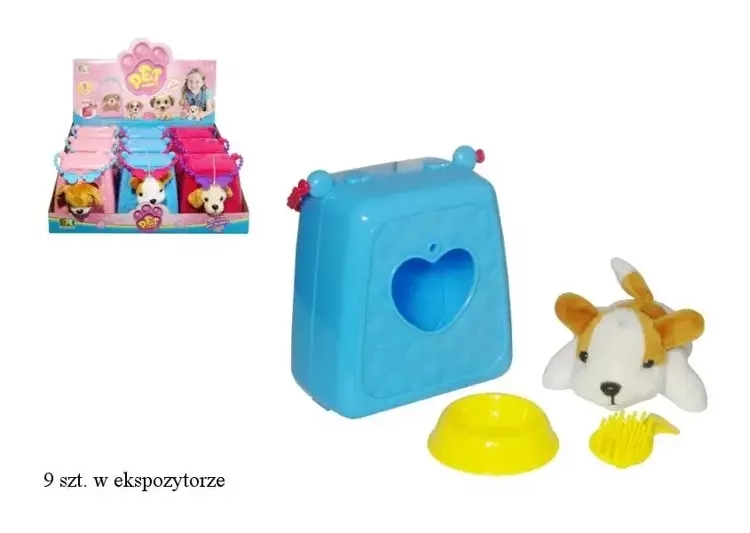 Zestaw dla małych miłośników zwierząt, w skład którego wchodzi pluszowy pies, torebka, szczotka i miseczka. Dzięki temu uroczemu zestawowi, małe dzieci będą mogły zabierać swojego pluszowego pupilka gdziekolwiek tylko zechcą. Torebka posiada funkcję otwierania, co ułatwia wyjęcie szczeniaczka. Zabawkę można kupić w różnych wariantach kolorystycznych, wybieranych losowo. Cena obejmuje jeden kompletny zestaw. Zabawka przeznaczona jest dla dzieci, które skończyły 3 lata.Rozmiar opakowania