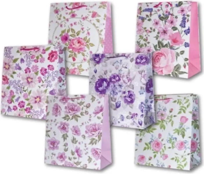 Aktualny produkt to średniej wielkości torebka ozdobna laminowana PL-6. Charakteryzuje się ona unikalnymi wzorami, reprezentującymi różne bukiety kwiatowe. Należy zauważyć, że wzory są różnorodne, a konkretne zestawienie jest wysyłane w sposób losowy do klienta.