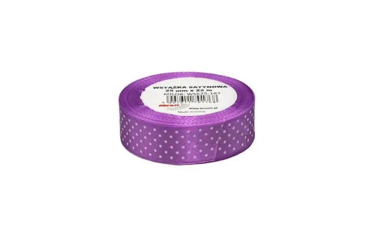 Zapraszamy do zapoznania się z naszą ofertą na jasnofioletową wstążkę satynową w urocze kropki. Jej wymiary to 25mm szerokości na 22m długości.