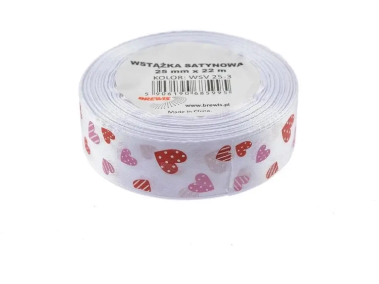 Wstążka satynowa w serca biała 25mmx22m - Brewis