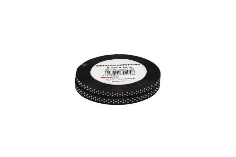 Czarna wstążka satynowa w białe kropki o parametrach 6mmx22m – zbiór dwóch sztuk