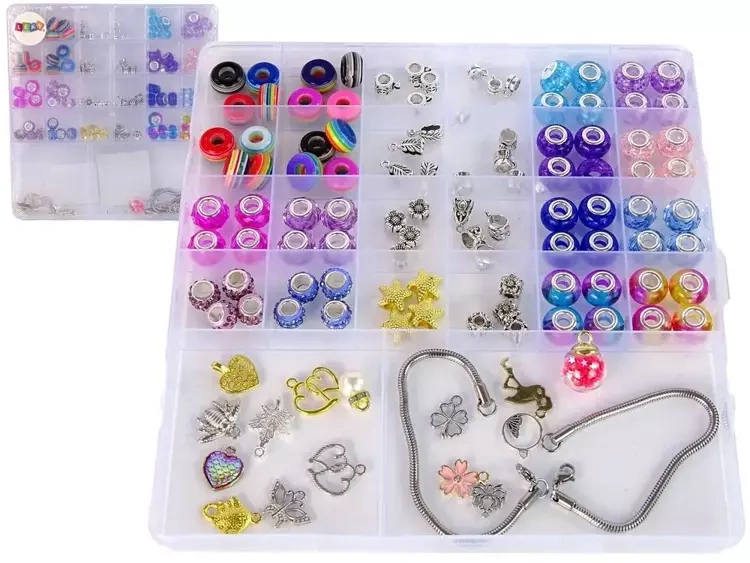 Zestaw zawiera wszystko, co potrzebne do stworzenia jedynych w swoim rodzaju, pięknych bransoletek. Dzięki dużemu organizerowi, w którym każdy z koralików ma swoje miejsce, łatwo utrzymać porządek podczas zabawy. W zestawie znajdują się 16 modeli koralików w różnorodnych odcieniach i przeróżne zawieszki – liście, rozgwiazdy, kwiatki, serduszka... Wszystko dla stworzenia indywidualnego stylu! Dodatkowo, zestaw zawiera akcesoria, które zapewnią pełny komfort tworzenia.
