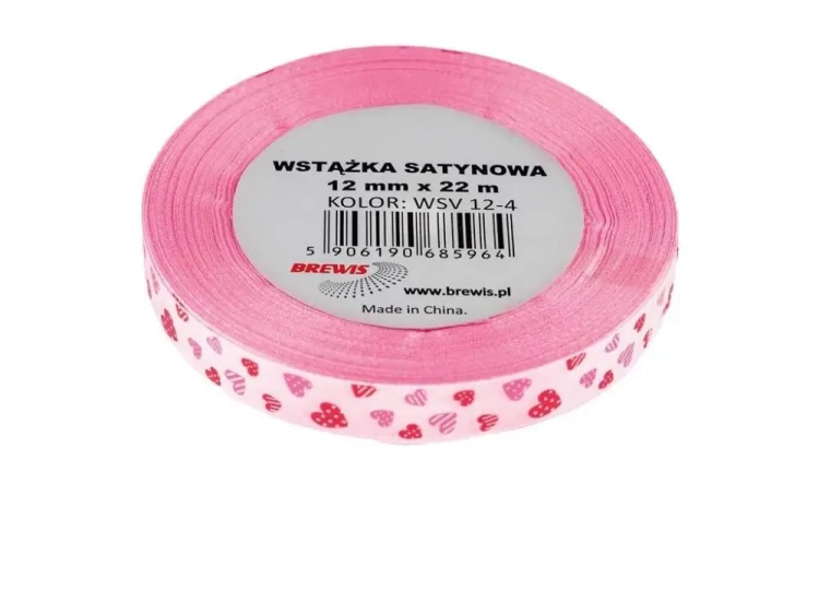 Wstążka satynowa serca różowa 12mmx22m - Brewis