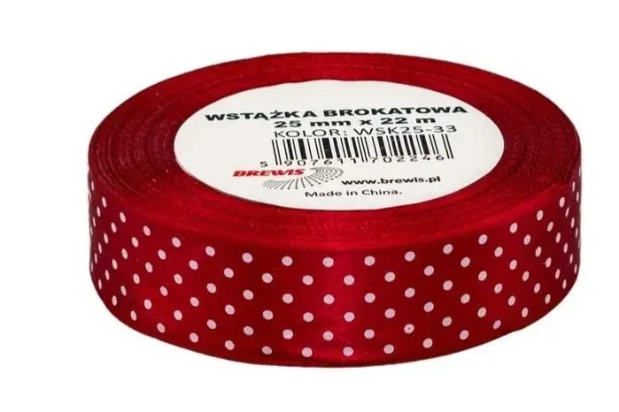 Ruda, satynowa wstążka ozdobiona kropkami, o wymiarach 25mmx22m