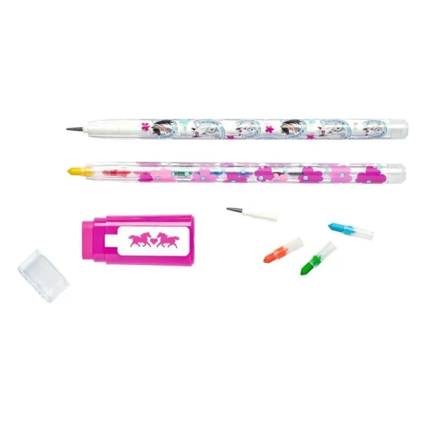 Zespół pojedynczego ołówka, kolorowej kredki z wymiennymi końcówkami w plastikowej obudowie i gumki brzmi jak przyszłość? To nie jest fantazja, ale prawdziwa, wielofunkcyjna pomoc i niepowtarzalna gratka dla każdej szkolnej piórnik. Set sklada się z części połączonych gumką zintegrowaną w końcówkę. Dzięki wielu możliwościom wymiany końcówek, ten ołówek i kredka oferują prawie nieskończone możliwości rysowania i pisania. Co więcej: nie ma potrzeby irytującego ostrzenia. Właściwości zestawu sprawiają, że serca entuzjastów koni biją szybciej: kredka jest udekorowana pięknymi kwiatami, a ołówek jest wykończony podkowy i słodkimi końskimi głowami. Z łatwością można usunąć zarówno ślady ołówka, jak i błędy umieszczenia kredką z użyciem gumki. Dobrze prezentujący się ołówek, kredka i gumka w kolorze narzutki będą dodatkiem do piórnika. Krytyka akcesorium może być ostatnia w różnych kolorach: fioletowy, żółty, turkusowy, lekki lub ciemny różowy. Ołówek ma wymienialne końcówki. Kredka ma 11 różnych kolorowych końcówek. Kolor kredki można łatwo zmienić, przenosząc końcówkę na koniec obudowy w plastikowym etui. Gumka połączona z narzucaną osłoną tworzy praktyczny set. Gumka ma wymiary: 1,5 cm x 1 cm x 0,5 cm. Wymiary ołówka i kredki: 14 cm x 0,6 cm x 0,6 cm. Produkt jest wysyłany losowo.