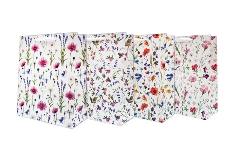 Ta torebka jest nie tylko funkcjonalna, ale również uroczo ozdobna. Jest pionowa i mierzy 40,5x31x12 cm. Została wykonana z uwagą o najdrobniejsze szczegóły, wśród których wyszczególnić należy cztery różne kwiatowe wzory, wszytskie na białym tle.