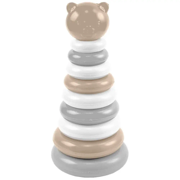 Misiowa Piramidka to idealna zabawka dla najmłodszych, która jest jedną z kluczowych zabawek edukacyjnych przeznaczonych dla dzieci. Zaprojektowana w pastelowych barwach beżu, mlecznej szarości oraz bieli, składa się z podstawy z słupkiem, na który maluch ma za zadanie nakładać kolejne kółka. Nakładanie odbywa się według rozmiaru - od największego, do najmniejszego. Układanka zakończona jest oddzielnym elementem, którym jest głowa misia, wieńcząca całą zabawkę.
