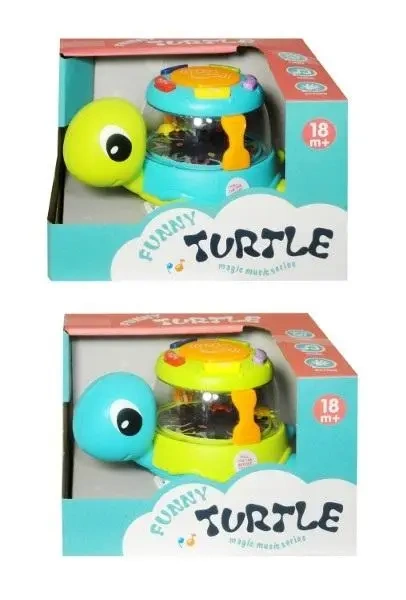 Ta zabawka to interaktywny żółwik, który wytwarza różnego rodzaju dźwięki, np. takie jak gra na bębenku czy specjalne melodie dla dzieci. Ma również funkcję grania świetlnych efektów dzięki kolorowym diodom LED. W środku tej muzycznej atrakcji ukryte są małe żółwiki, które wydają dźwięk grzechotki. Zasilanie zabawki odbywa się poprzez baterie AAA, które nie należą do zestawu.