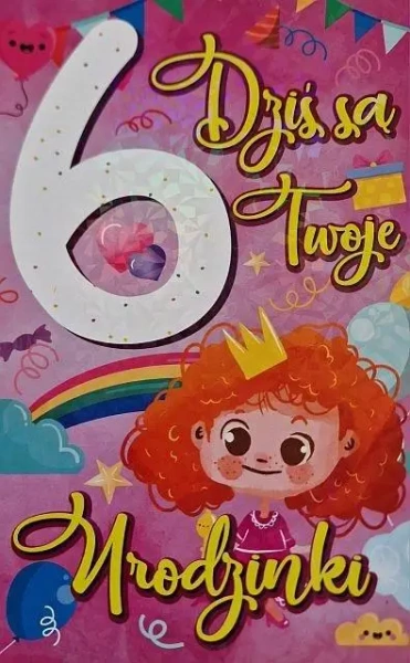 Elegancki, dwustronicowy karnet urodzinowy dla dziewczynki, upiększany mieniącym się lakierem holograficznym. W środku znajdują się gotowe życzenia, idealne do złożenia na sześć urodziny. To klasyczne rozwiązanie dla tych, którzy cenią tradycyjne formy okazywania uczuć i życzeń.
