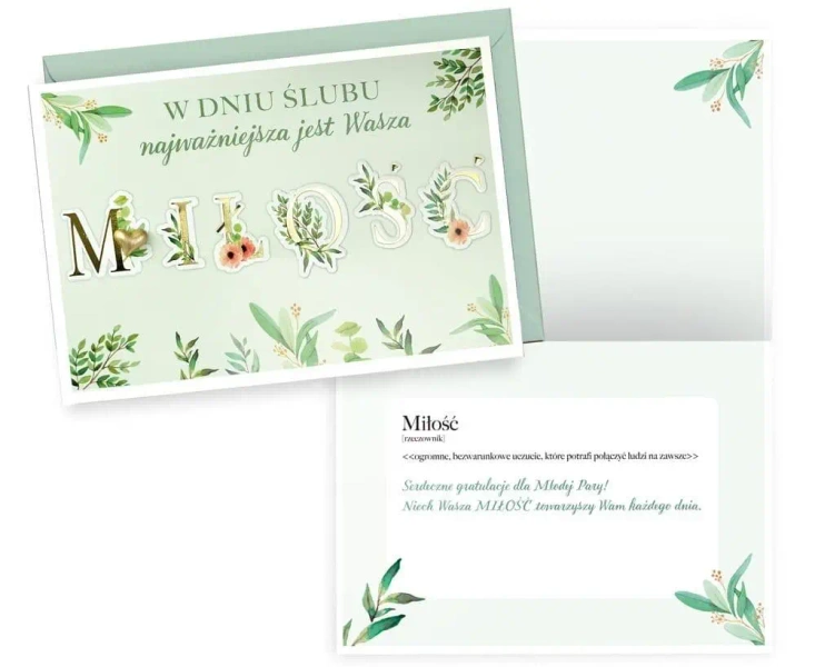 Pomniejszych rozmiarów, ale efektowna karta ślubna z ozdobnej linii produktów Dream Cards przyciąga wzrok atrakcyjnymi barwami i ładnymi zdobieniami. Jest to doskonałe połączenie przystępnej ceny i wysokiej jakości. Wyjątkowe cechy produktu to: format B6, czyli po złożeniu ma wymiary 16.6 x 11.7 cm. Dodatkowo, karnet posiada w zestawie kolorową kopertę.