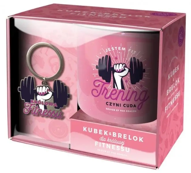 Przedstawiamy atrakcyjny zestaw dedykowany miłośnikom fitnessu; składa się z urokliwego kubka oraz breloka wykonanego z metalu.