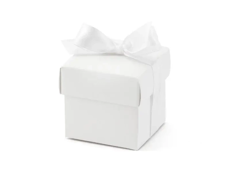 Delikatne białe pudełka z kokardką, stworzone z wysokiej jakości papieru, idealnie nadające się na drobne upominki dla gości. Każde pudełko jest udekorowane satynową taśmą, co nadaje im wyjątkowej elegancji. Po złożeniu pudełka mają wymiary 5,2x5,2x5,2 centymetrów, co sprawia, że są praktyczne i stanowią wygodną opcję na małe prezenty. W opakowaniu znajdują się 10 sztuk pudełek.