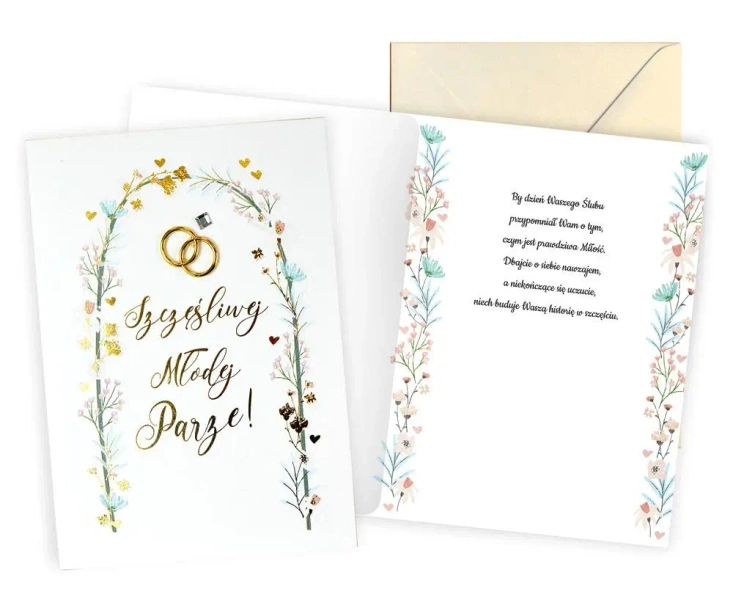 Wymiary kartki po złożeniu wynoszą 14,5 x 19,5 cm, co czyni ją kompaktową i kieszonkową. Wnętrze karty zawiera wyjątkowe życzenia skierowane do Państwa Młodych.