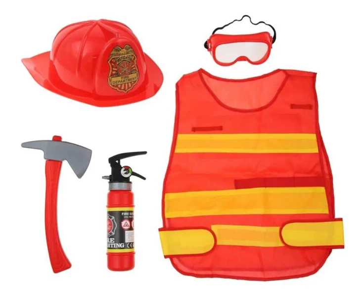 Podsumowując: - Kamizelka oraz gaśnica, toporek, hełm i gogle tworzą pakiet, - Długość gaśnicy: 23 cm, - Obwód hełmu: 53 cm, - Gogle na gumkę, - Kolorystyka: czerwień, żółć, - Materiały: plastik, kamizelka - poliester.EAN: 5902973184754