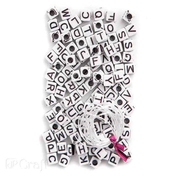 Podstawa koralików jest w kolorze białym, co podkreśla kontrast z naniesionymi na nich czarnymi literami. Tło ułatwia odczytanie liter, jednocześnie dodając elegancji i nowoczesnego wyglądu każdemu projektowi.