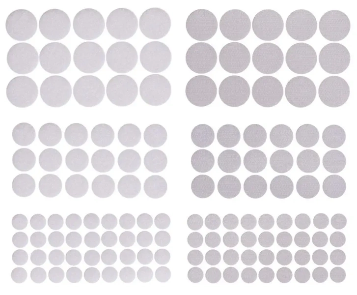Przedstawiamy zbiór okrągłych, białych rzepów samoprzylepnych, dostępnych w trzech odmiennych wielkościach. Umożliwiają one kilkukrotne łączenie oraz rozłączanie różnorodnych elementów.