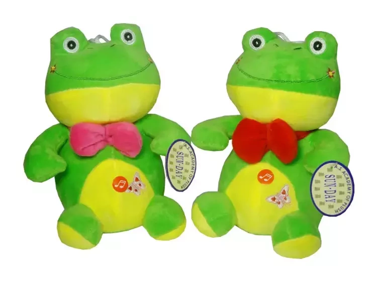 Zachwycająca pluszowa żabka ozdobiona elegancką kokardą, która wydaje dźwięk.