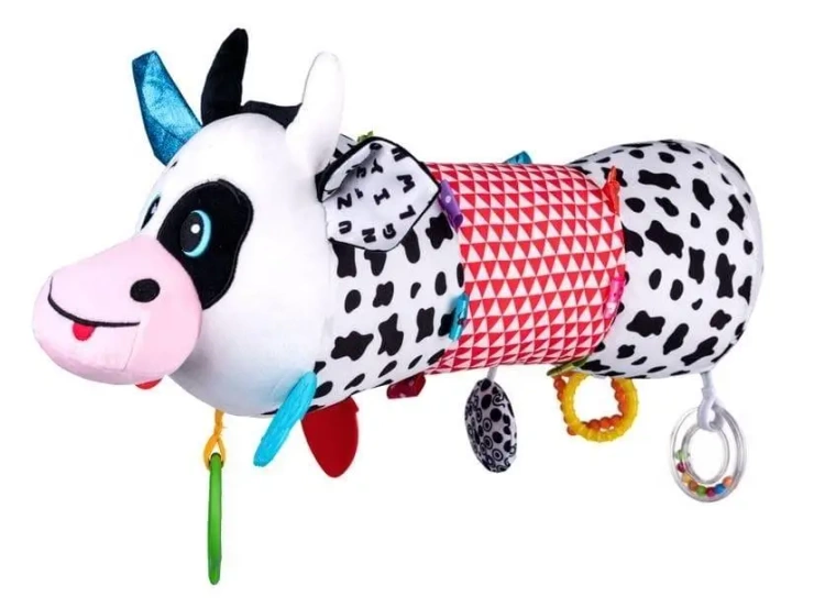 Zabawka nie tylko posiada ujmujący wygląd, ale także pełni funkcję edukacyjną - umocowane w wałku elementy zaskakują różnorodnością i zdecydowanie zaciekawią każde dziecko. Twój maluch będzie mógł bawić się szeleszczącymi uszkami krówki, gumowymi i plastikowymi gryzakami, grzechotką z kolorowymi kuleczkami oraz piszczałką.