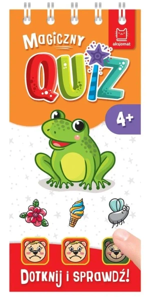 "Magiczny quiz" to doskonała zabawa dla dzieci. Magiczna farba zapewnia wielokrotną zabawę i zachęca dzieci do sprawdzania swojej wiedzy oraz poznawania świata. Czarne pola znikają i pojawiają się na nowo. Aby wskazać odpowiedź, należy delikatnie potrzeć pokryty farbą termiczną kwadracik przez około 5 sekund - pod wpływem ciepła pojawi się znaczek poprawnej lub błędnej odpowiedzi. W książce zamieszczonych jest 76 pytań obrazkowych wraz z odpowiedziami. Quiz to pomysł na udany prezent i interesującą naukę.