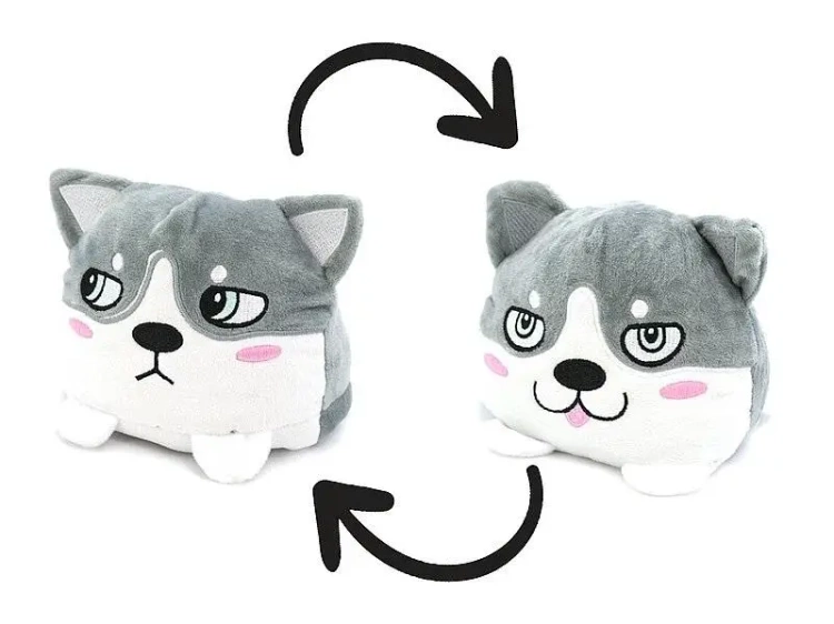 Urocza maskotka dwustronna w kształcie psa, o wysokości 15 cm.