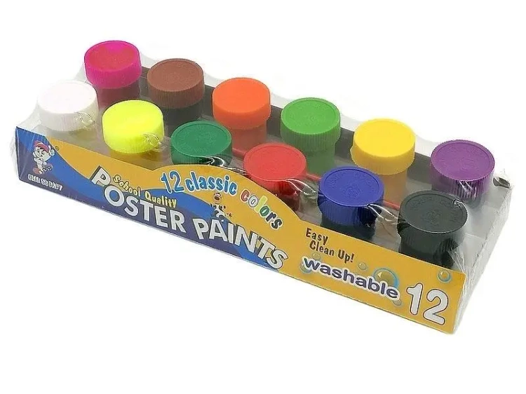 Prezentowany tutaj zestaw zawiera 12 farb, które doskonale sprawdzą się w rękach małych i dużych artystów. Każda z farb to inny, żywy kolor przyciągający wzrok. Dodatkowym atutem zestawu jest dołączony pędzelek, który umożliwia namierne i precyzyjne przekładanie pomysłów na papier.